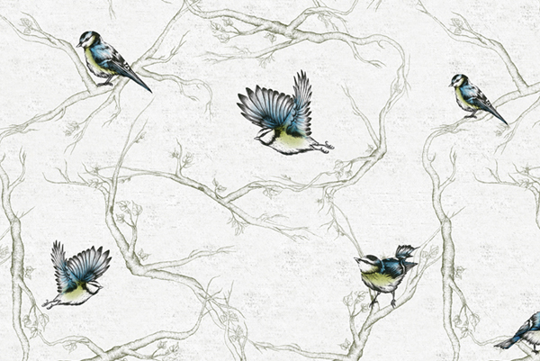 Cyanistes is the latin for bluetits, and this light and elegant design, hand coloured using vivid tones, features this delicate little bird fluttering around a fine network of branches. A fresh yet distinctive design, Cyanistes looks enchanting either draped, hung or upholstered.