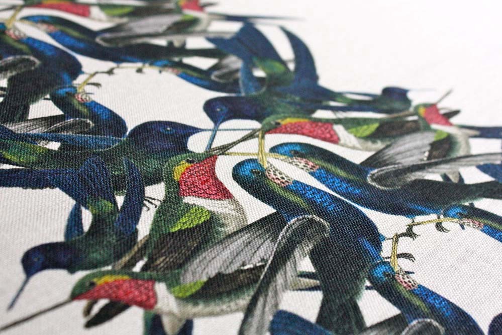 Our much-loved Hummingbird Stripe is a bold, vibrant and intricately detailed fabric featuring a mesmerising pattern of beautifully hand drawn and coloured hummingbirds, which was inspired from our archive of antique encyclopaedia of natural history. This design is also available in a striking wallpaper printed onto a stone coloured background. The combination of both fabric and wallpaper creates a spectacular statement.