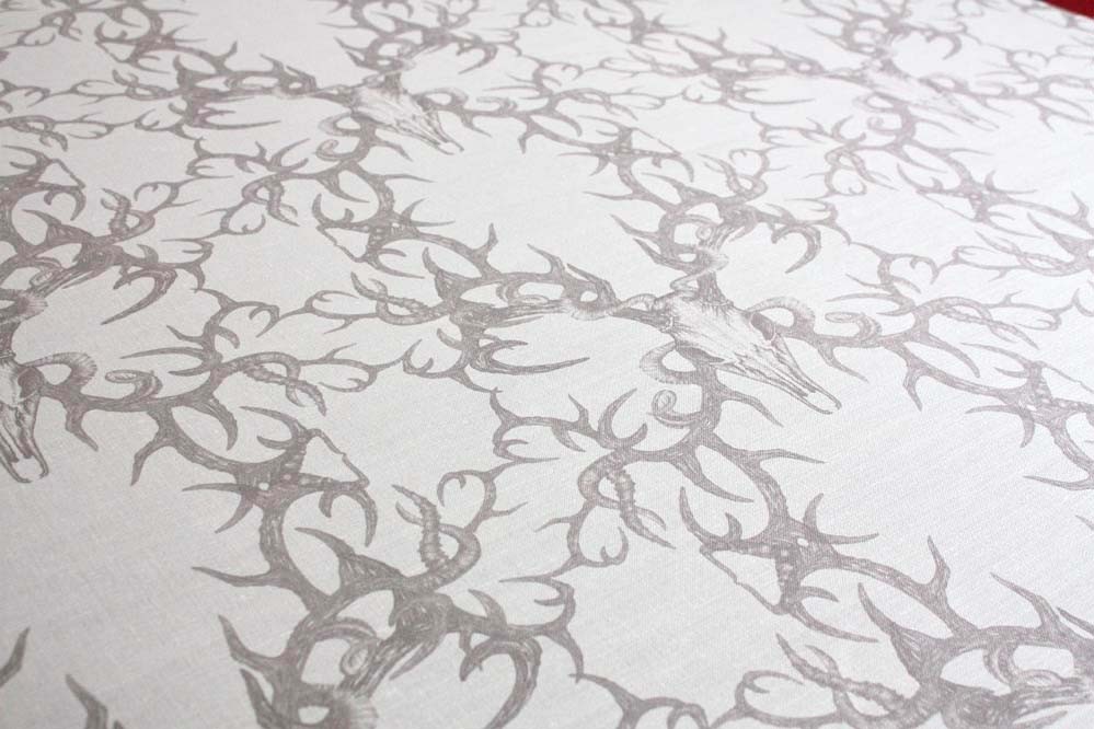 Winter’s Bone features intricately drawn antlers formed into a complex and elegant fretwork, interspersed with dramatic deer skulls. This pattern evolved over time, with different skulls including ibex and mountain goat, before we settled on this version, which will add a touch of rustic or even gothic edge to a room.