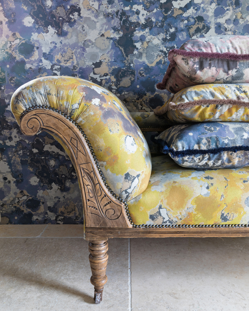 Alliga is a fabulously striking design. Its our interpretation of algae and lichen that forms in beautiful patterns on rock faces by the sea shore and on trees in woods. From our colour trials, we selected Absinthe as we loved the intensity of this really useable colour; the ink and blush look magnificent made up and also work perfectly with the more simple fabrics such as Chevron, Pen & Ink and Winter’s Bone from The Curator collection.